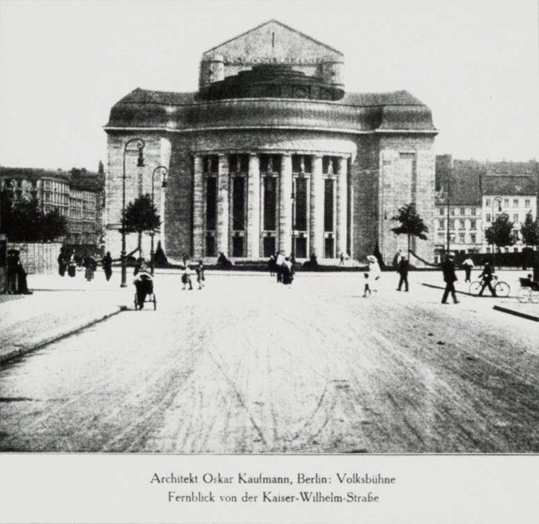 And here’s a small piece of Berlin trivia for your next pub quiz: two years before the Reichstag building got its inscription “Dem Deutschen Volke” (For the German People), the Volksbühne - designed for the Verein by the brilliant theatre-architect, Oskar Kaufmann - featured an equally apt inscription “Die Kunst Dem Volke” - Art for the People.