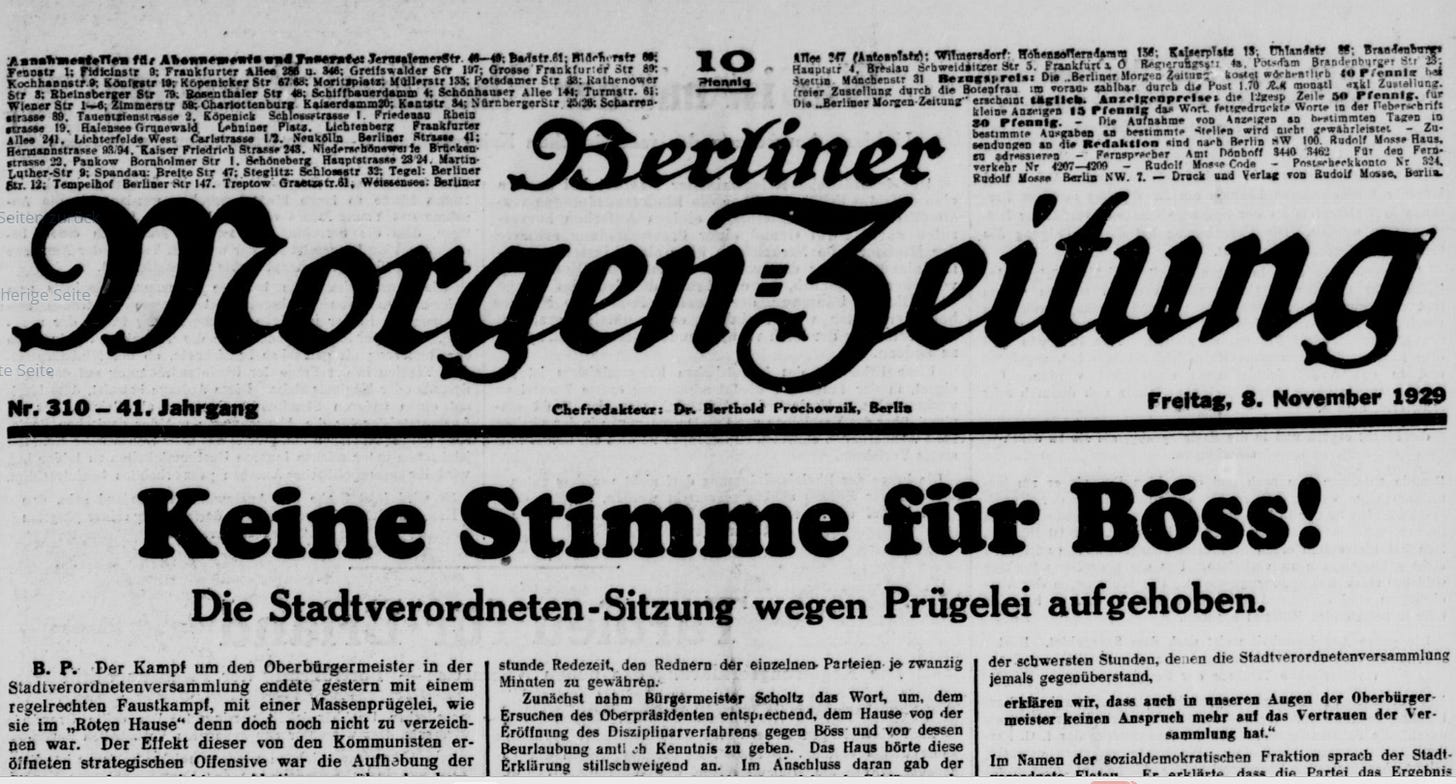 Less than two months later, on November 7, 1929, Berlin’s popular and very capable governing mayor, Gustav Böß, chose to resign just ten days before communal election.