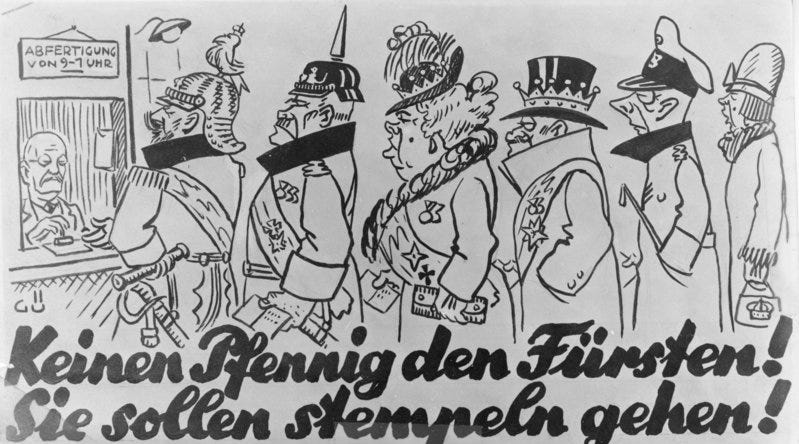For the first time ever, German people were to decide what should happen to the Fürstenvermögen (“Princely Fortunes”), the vast wealth collected by the richest families in the land whose members were staunch supporters of the Kaiser and his First-World-War politics which left the country socially and economically ruined. Often, these were the people actively involved in the process, whether as top-rank military or as cabinet members, investors, etc. Now the national referendum could decide what should happen to their money and estates: should it all be returned to the super-rich or, rather, should it be nationalised without any compensation.