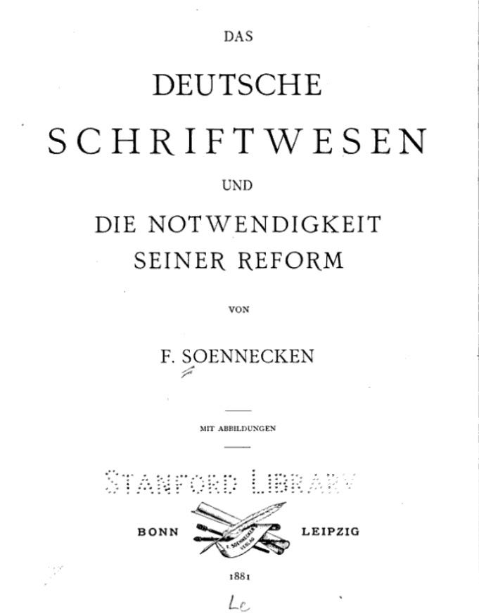 The typeface conflict erupted again in 1881 after Prussian entrepreneur and inventor, Alfred Soennecken, called for a reform. Antiqua should be taught and used in German schools as well.
