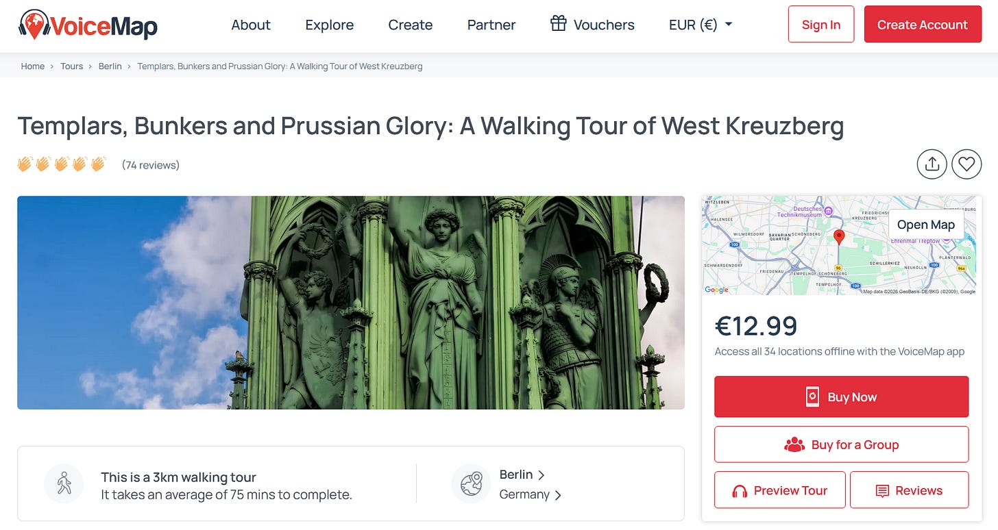 If you enjoy learning more about Berlin’s less trodden paths and are in Berlin or planning to visit, you can enjoy a pleasant audio-walk through this area (starting further south the old Belle-Alliance-Straße and up the Kreuzberg Hill, as well as through the leafy Viktoriapark) with me as the guide in your ear. My GPS-controlled audio-tour “Templars, Bunkers and Prussian Glory: A Walking Tour of West Kreuzberg” is available via VoiceMap. Just download the app, then the tour, pop your earphones on and go!