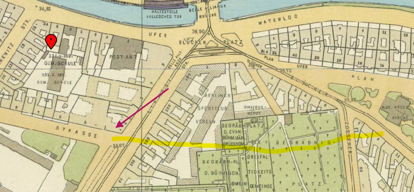 That’s how the old street corner photographed by Bartels at the beginning of the twentieth century corner became a junction of Mehringdamm and Blücherstraße. Not something anyone would have considered possible (or come to that, necessary) in 1907.