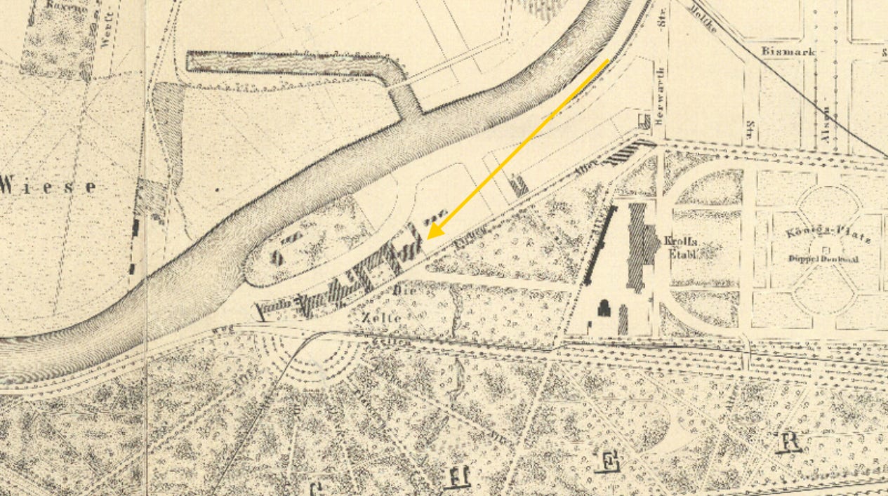 Die Zelten vanished abruptly in the dense clammy fog of the Second World War. Later the area would remain an abandoned, forlorn shadow of its own self. Until new urban planning for the federal government district would have its traces disappear for good.