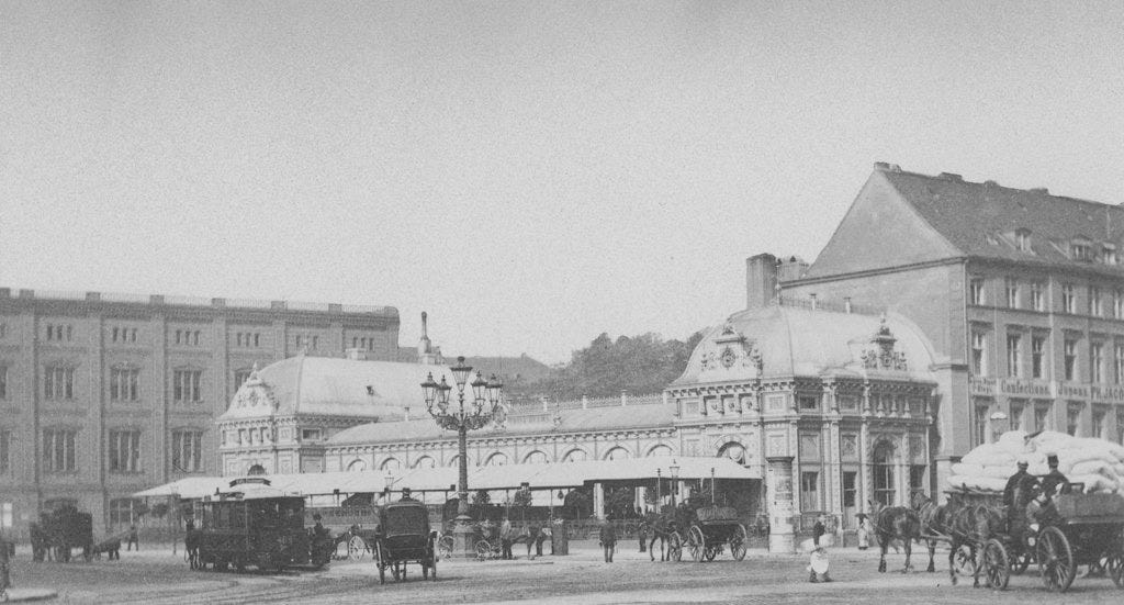 Yet the most renowned cafe in Schloßfreiheit was Café Helms - the barrel-roof building on the left edge of Hermann Rückwardt’s 1890 photo. Built in 1882-1883 where the old Werder Mills used to be, it was one of the first pre-fab truss buildings in Berlin. It would be demolished along with the rest of the street only ten years later: Kaiser Wilhelm II, not a fan of the street’s architecture (which bothered him as too proletarian and too close to his imperial lair) had it removed.